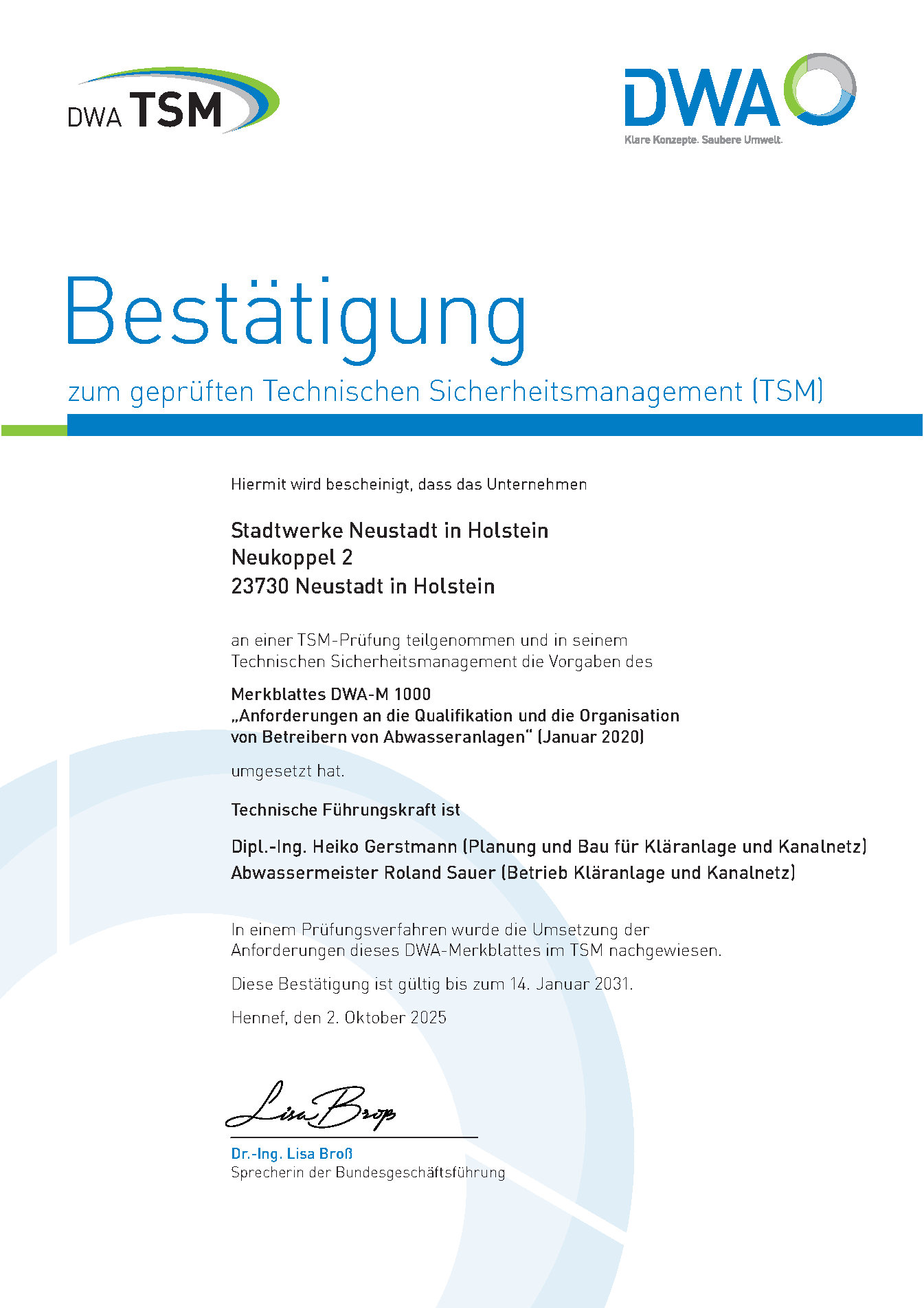 Das Zertifikat für das Technische Managementsystem (TSM) Abwasser bescheinigt, dass wir bei der Abwasserentsorgung und -aufbereitung höchste Umweltschutz-, Sicherheits- und Qualitätsstandards einhalten. Es umfasst die Betriebsführung, die technische Infrastruktur sowie die kontinuierliche Optimierung der Abläufe, um eine effiziente, umweltfreundliche und sichere Abwasserbehandlung zu gewährleisten.